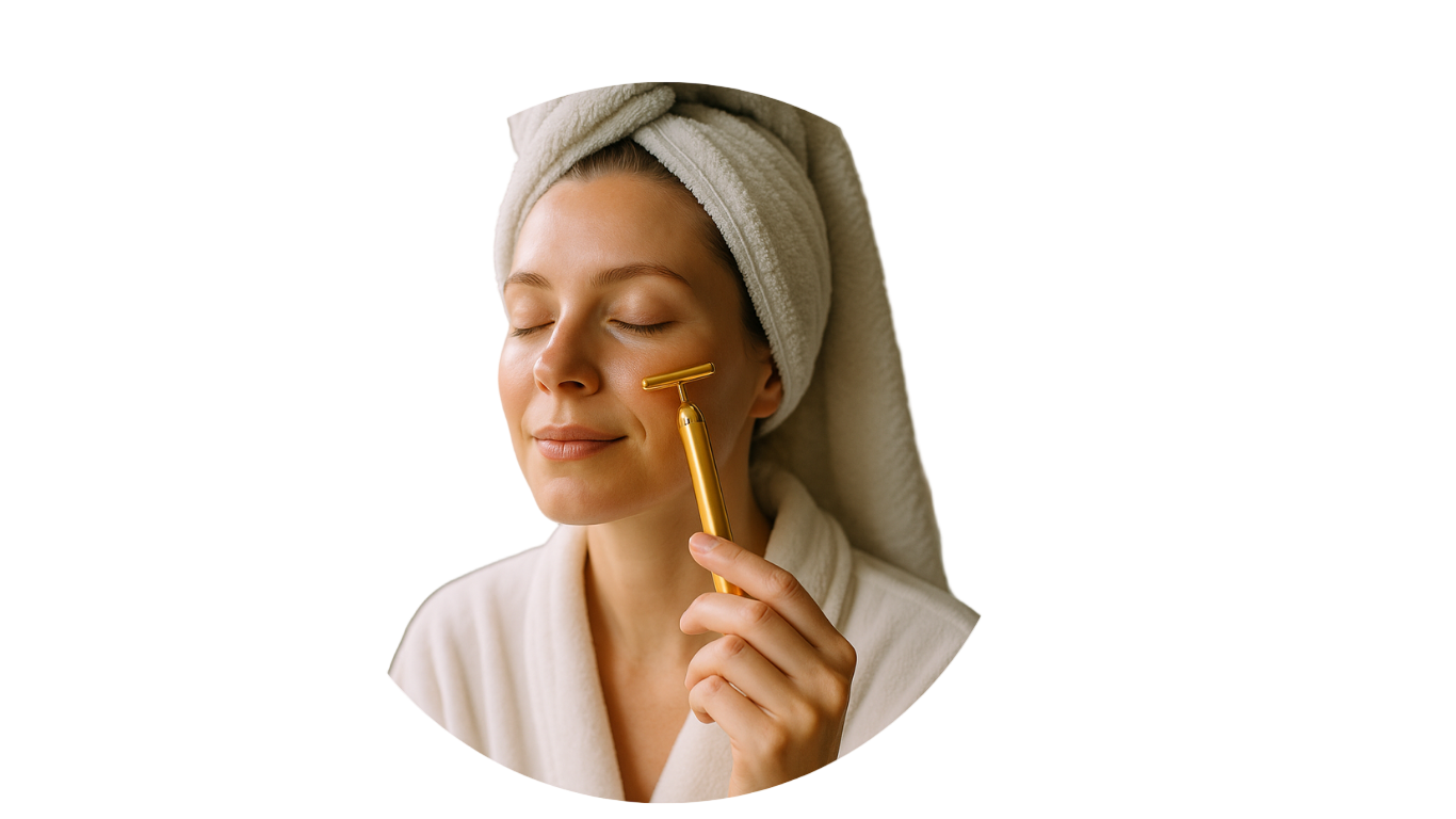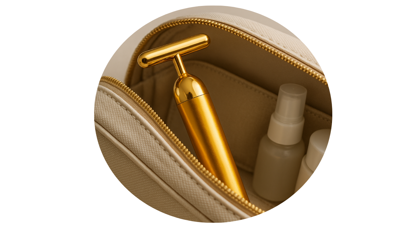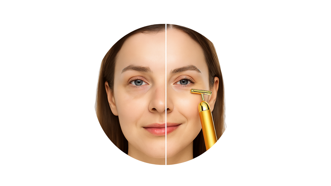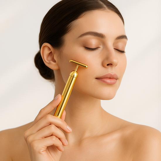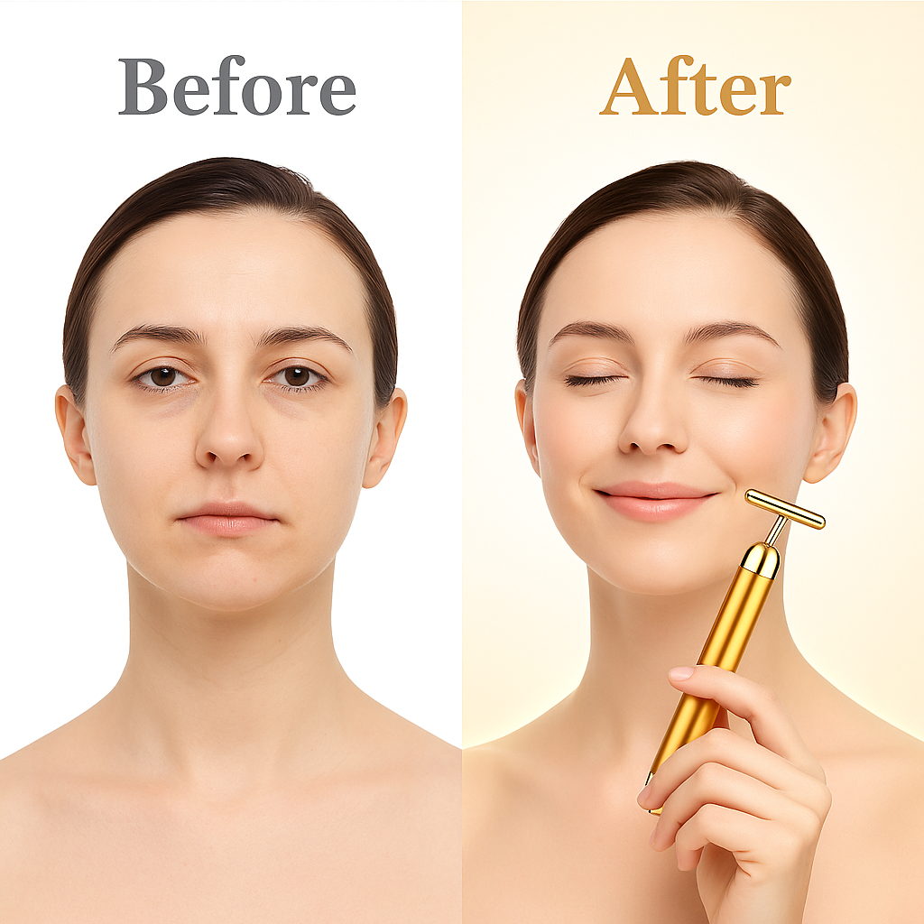 Glow Like Never Before — 24K Face Massager Bring spa-level care home. The T-shaped 24K gold-plated massager uses gentle micro-vibrations to boost circulation, reduce puffiness and improve the absorption of your serums. Lightweight, battery powered and travel friendly.